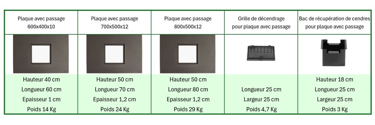 Cette plaque avec passage est en fonte, coulée dans nos fonderies de Haute-Marne, avec le souci du détail et de la qualité. Cette plaque dispose d'une finition peinture haute température gris foncé métallisée 7056. Notre plaque unie avec passage 700 x 500 dispose d'une hauteur de 500 mm, d'une longueur de 700 mm et d'une épaisseur de 12 mm, son poids est de 24 kilogrammes. Cette plaque dispose également d’un passage central de dimension 25 cm x 25 cm avec un rebord de 15 mm permettant l’insertion d’un bac de récupération de cendre et la mise en place d’une grille de décentrage par-dessus celui-ci. Ces deux derniers éléments sont vendus séparément.