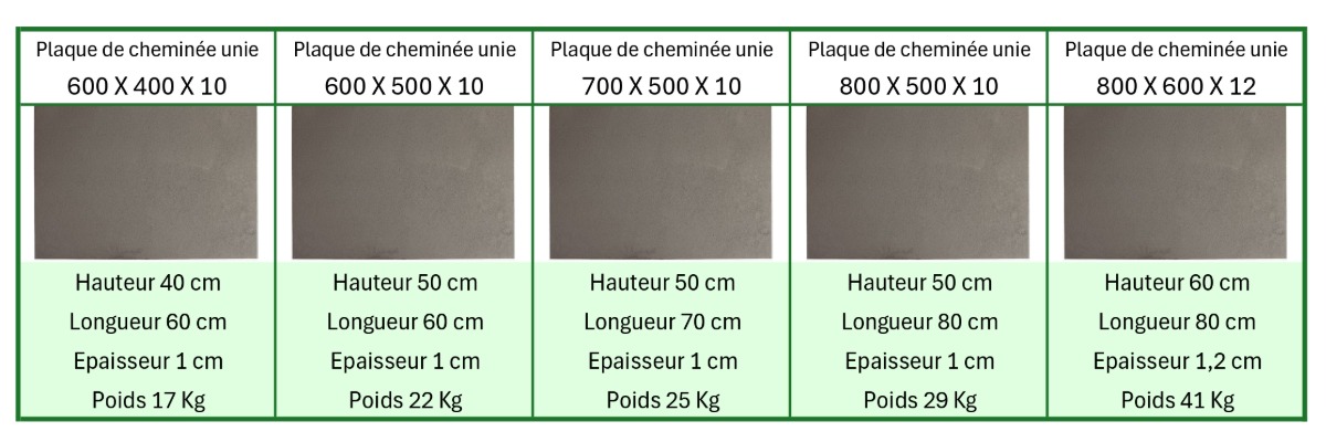 Cette plaque de cheminée est en fonte, coulée dans nos fonderies de Haute-Marne, avec le souci du détail et de la qualité. Cette plaque dispose d'une finition peinture haute température gris foncé métallisée 7056. Notre plaque unie 600 x 500 dispose d'une hauteur de 500 mm, d'une longueur de 600 mm et d'une épaisseur de 10 mm, son poids est de 22 kilogrammes.