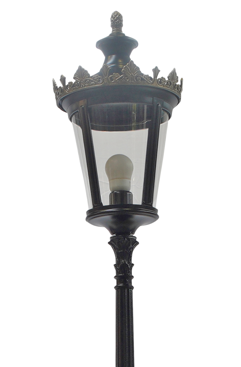 - Lanterne en aluminium assemblée en tôlerie soudée par points noir RAL 9005 avec couronne supérieure et pomme de pin inférieure dorées, et un diffuseur en verre clair soufflé monobloc, équipée de 2.40 m de câble électrique. Elle propage une lumière diffuse à 360 degrés, illuminant uniformément votre espace extérieur