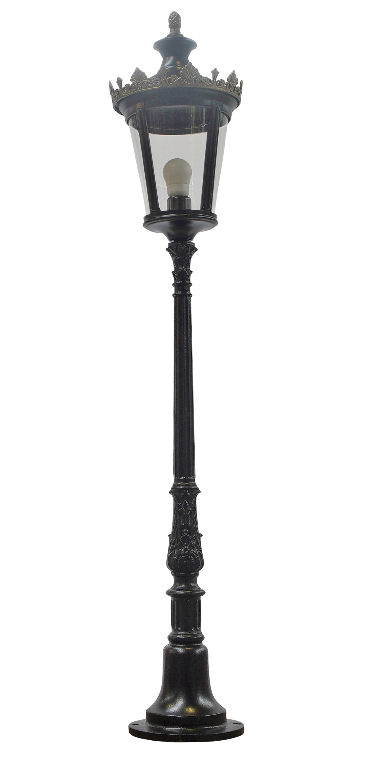 Les composants de ce candélabre en fonte sont d'abord grenaillés puis sablés ; ils sont ensuite métallisés puis peints en noir RAL 9005 par thermolaquage assurant un traitement anti-corrosion de qualité. La lanterne en aluminium dont il est équipé, est assemblée en tôlerie soudée par points noir RAL 9005 avec couronne supérieure et pomme de pin inférieure dorées ainsi qu'un diffuseur en verre clair soufflé monobloc et 2.40 m de câble électrique. Elle est pourvue d'un culot à vis E27 (pouvant recevoir une ampoule LED) et a un indice de protection 44/classe 1, assurant une excellente durée de vie, même en cas d'utilisation intensive et en zone côtière. Les pattes de scellements et le gabarit de perçage fournis vous permettront une installation simplifiée. Sa hauteur totale est de 1,46 m. Dimensions de la lanterne : Hauteur 493 mm Largeur 292 mm