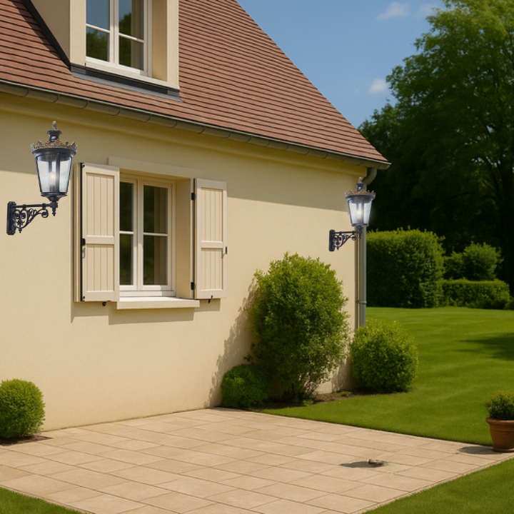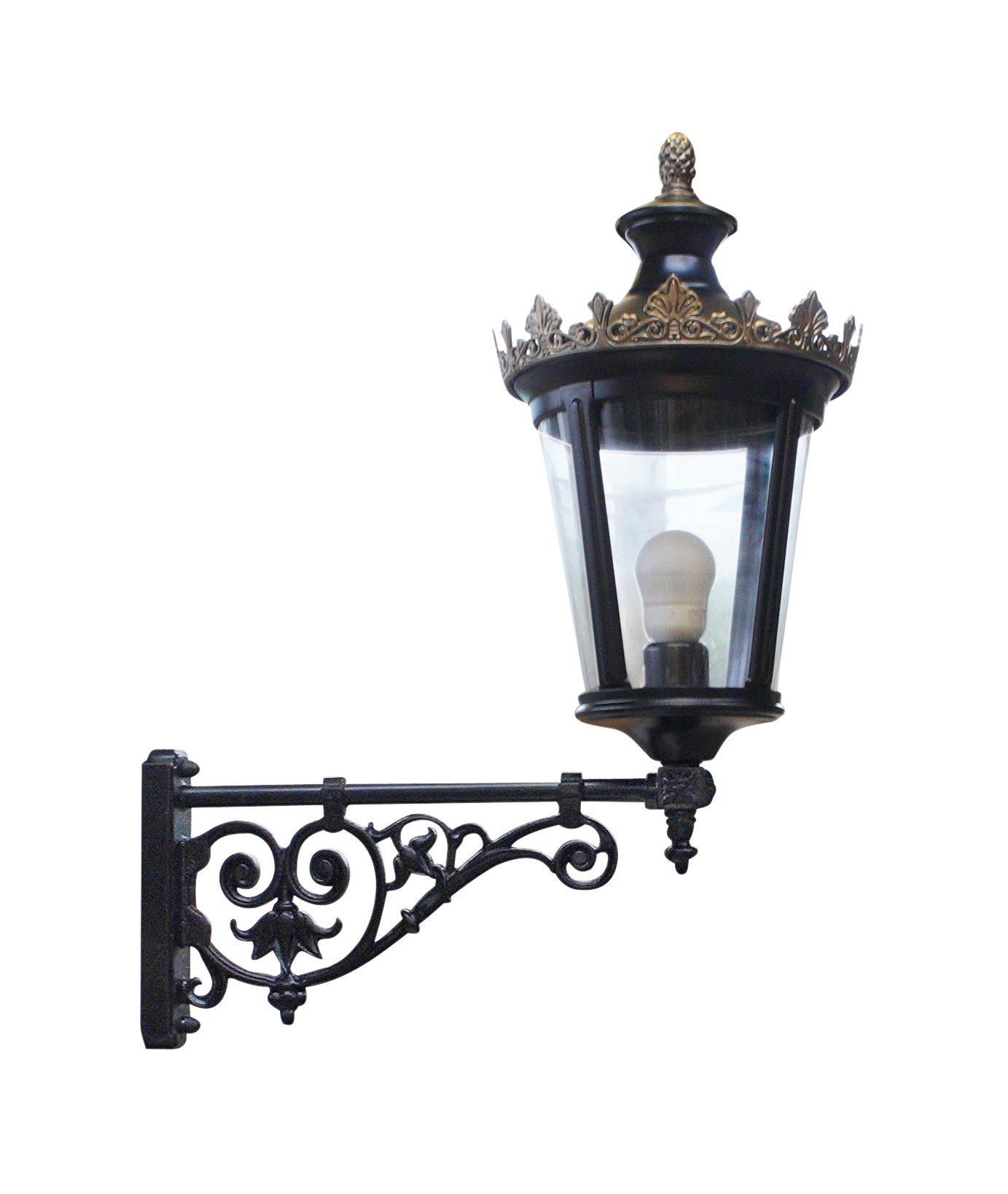 Les composants de cette console en fonte sont d'abord grenaillés puis sablés ; ils sont ensuite métallisés puis peints en noir RAL 9005 par thermolaquage assurant un traitement anti-corrosion de qualité. La lanterne en aluminium dont elle est équipée, est assemblée en tôlerie soudée par points noir RAL 9005 avec couronne supérieure et pomme de pin inférieure dorées ainsi qu'un diffuseur en verre clair soufflé monobloc et 2.40 m de câble électrique. Elle est pourvue d'un culot à vis E27 (pouvant recevoir une ampoule LED) et a un indice de protection 44/classe 1, assurant une excellente durée de vie, même en cas d'utilisation intensive et en zone côtière. Les chevilles, vis de fixation et le gabarit de perçage fournis vous permettront une installation simplifiée. Sa longueur totale est de 0,54 m. Dimensions de la lanterne : Hauteur 493 mm Largeur 292 mm