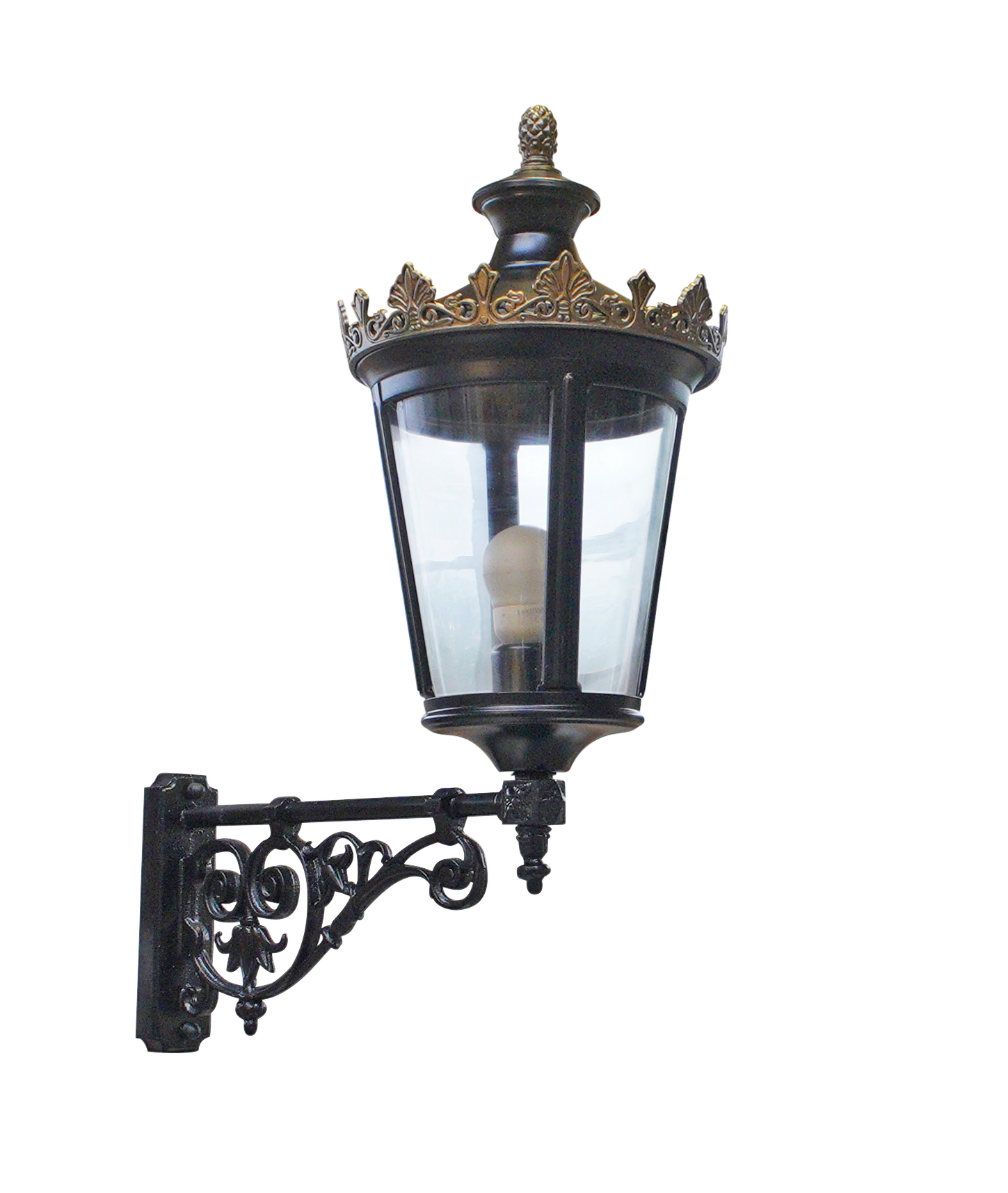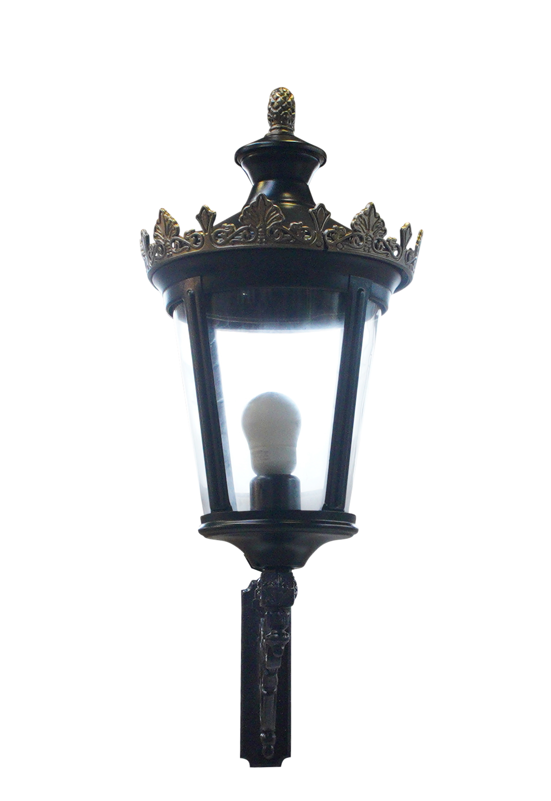 - Lanterne en aluminium assemblée en tôlerie soudée par points noir RAL 9005 avec couronne supérieure et pomme de pin inférieure dorées, et un diffuseur en verre clair soufflé monobloc, équipée de 2.40 m de câble électrique. Elle propage une lumière diffuse à 360 degrés, illuminant uniformément votre espace extérieur