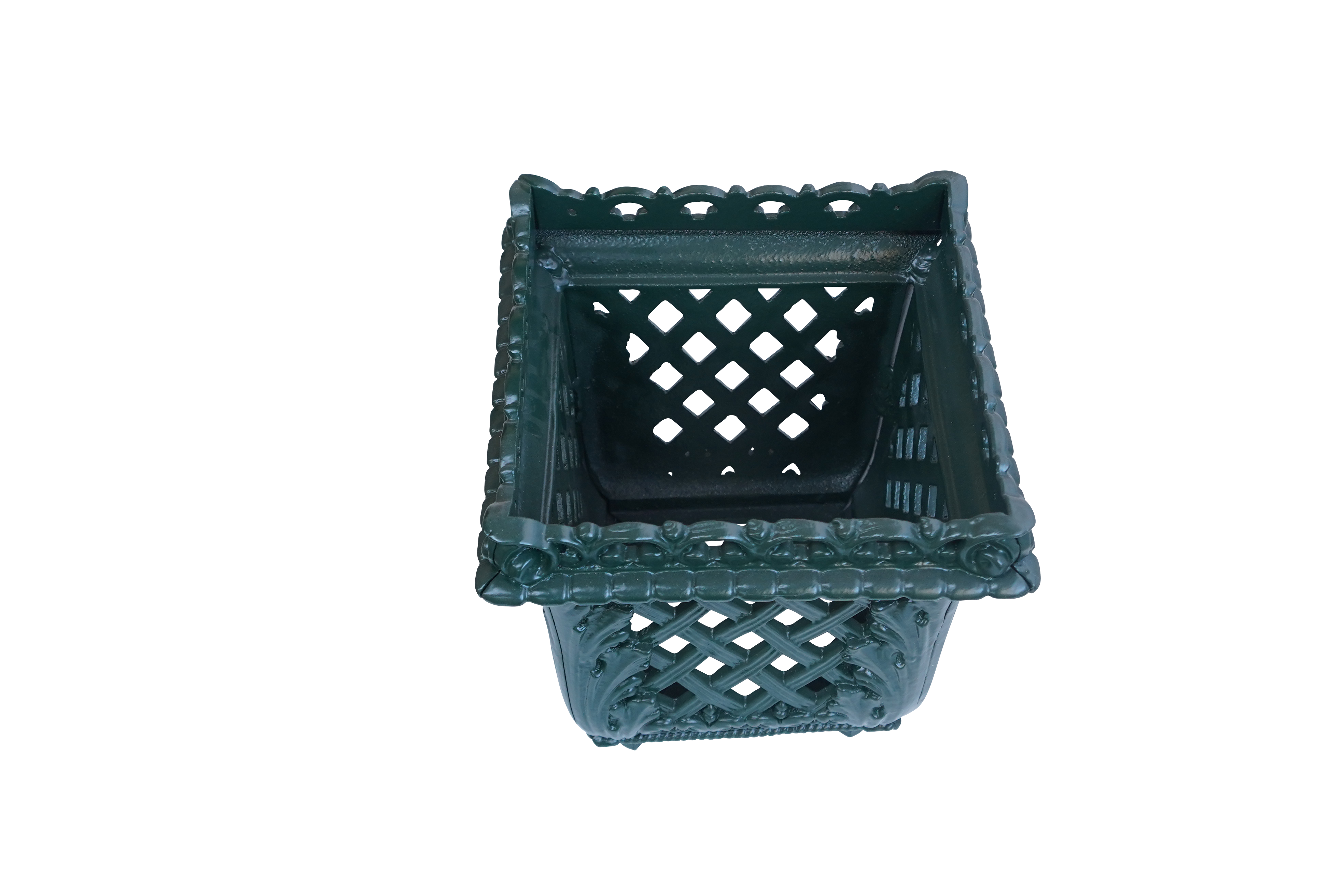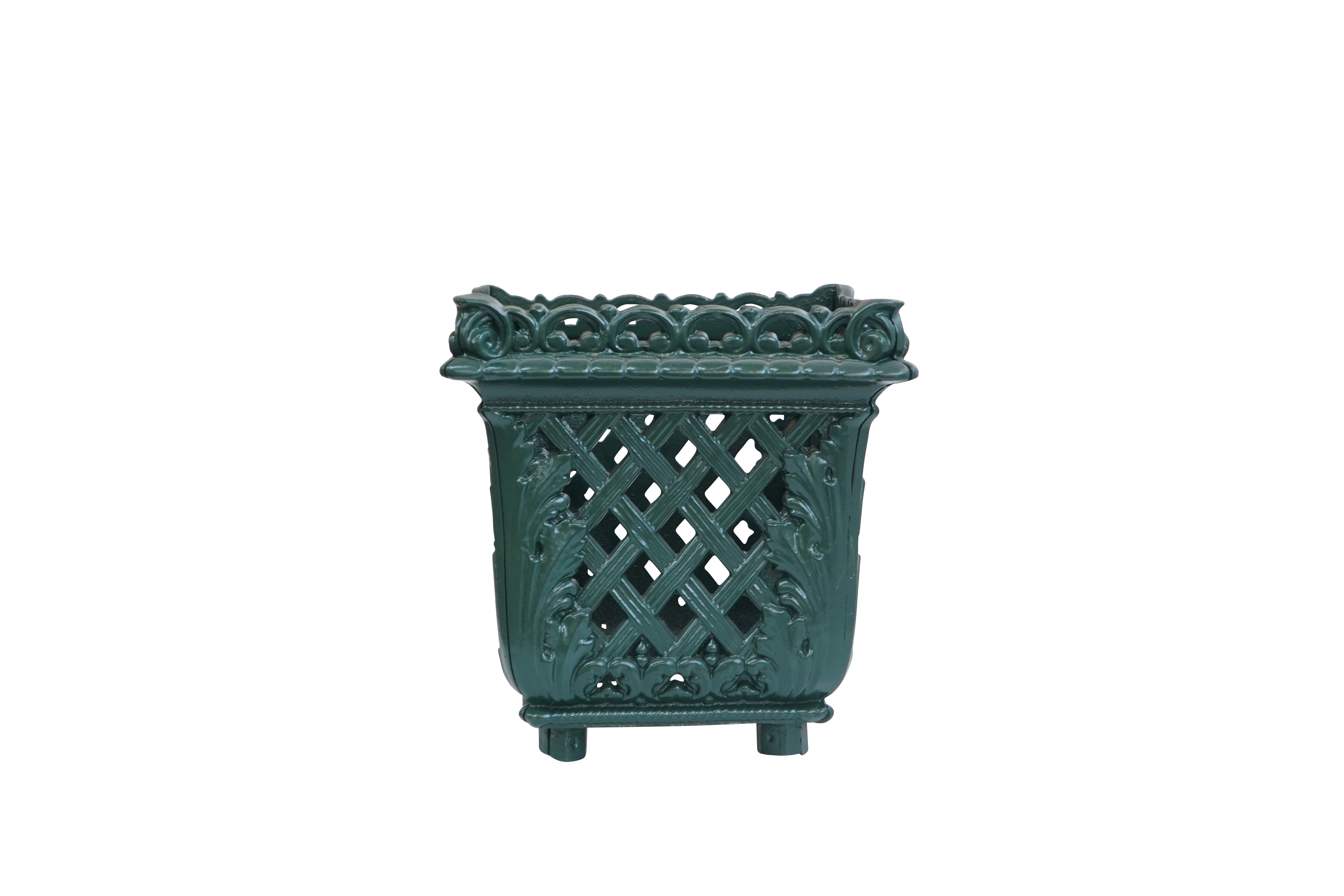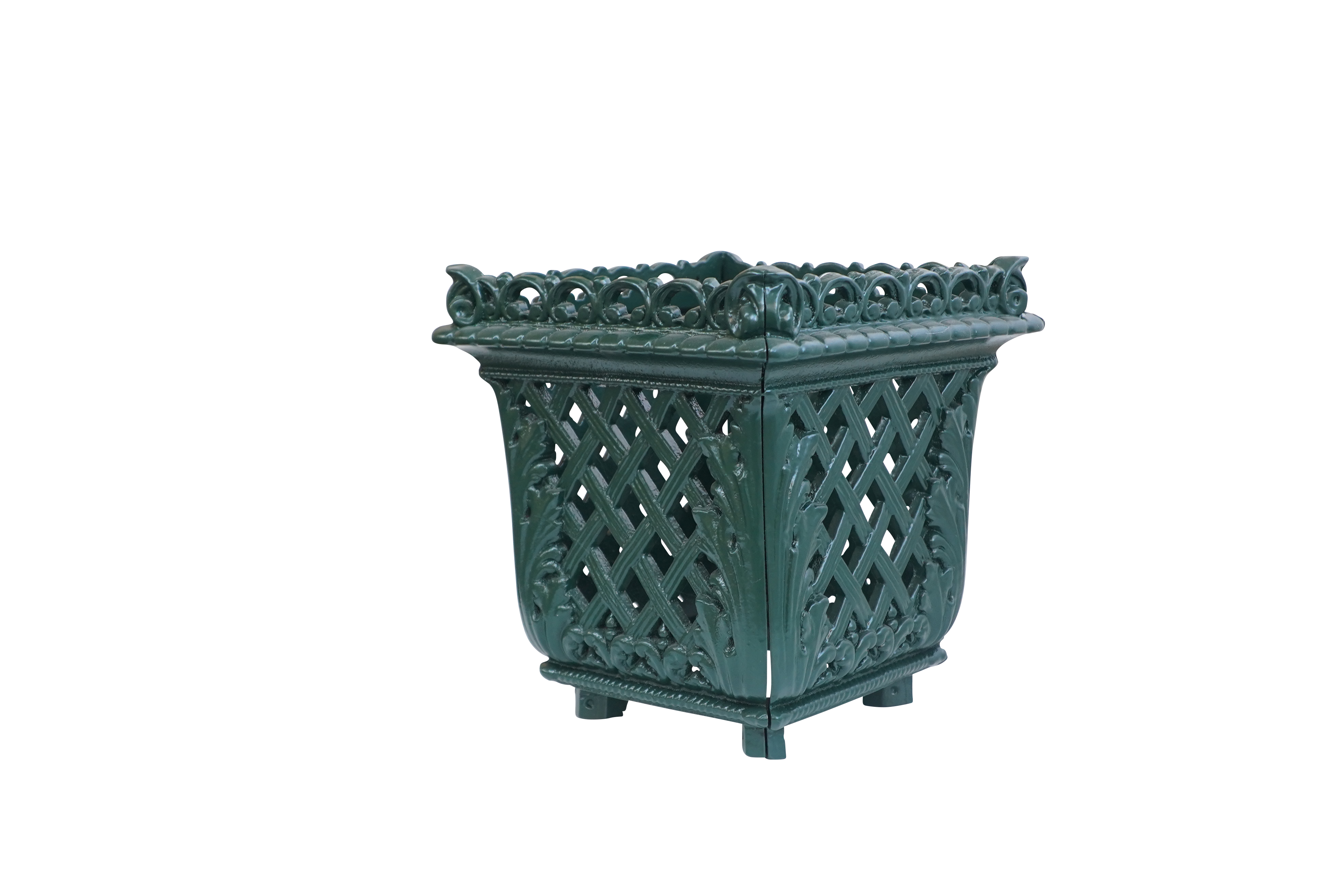 Ce cache pot décoratif accepte les pots accompagnés de leur coupelle. Il est coulé dans nos fonderies de Haute-Marne, avec le souci du détail et de la qualité. Les composants de ce cache pot en fonte sont d'abord grenaillés puis sablés ; ils sont ensuite métallisés puis peints par thermolaquage assurant un traitement anticorrosion de qualité. Longueur : 0.26 m. Largeur : 0.26 m. Hauteur : 0.27 m. Poids :6 Kg. Photo non contractuelle.